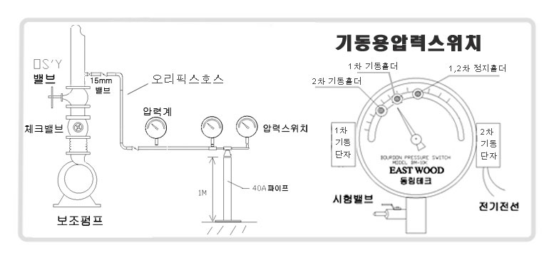 보조펌프 토출측 OS'Y밸브 상단에 15mm 니쁠과 함께 볼밸브, 후렉시블호스를 설치하고 압력계,기동용 압력스위치를 그림과 같이 설치하고 지지대를 세워 고정한다.